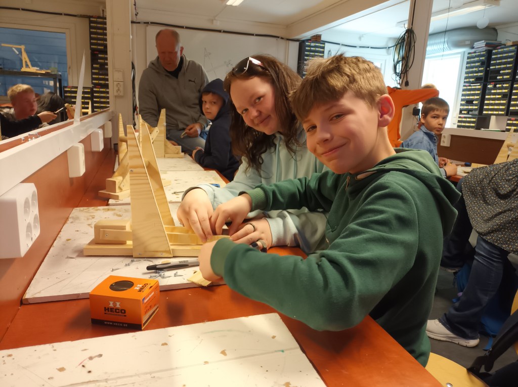 Nytt besøk fra en sjetteklasse som bygger katapult. Takk for god hjelp fra elevene i valgfaget «Teknologi og Design» som hjelper til med byggingen.