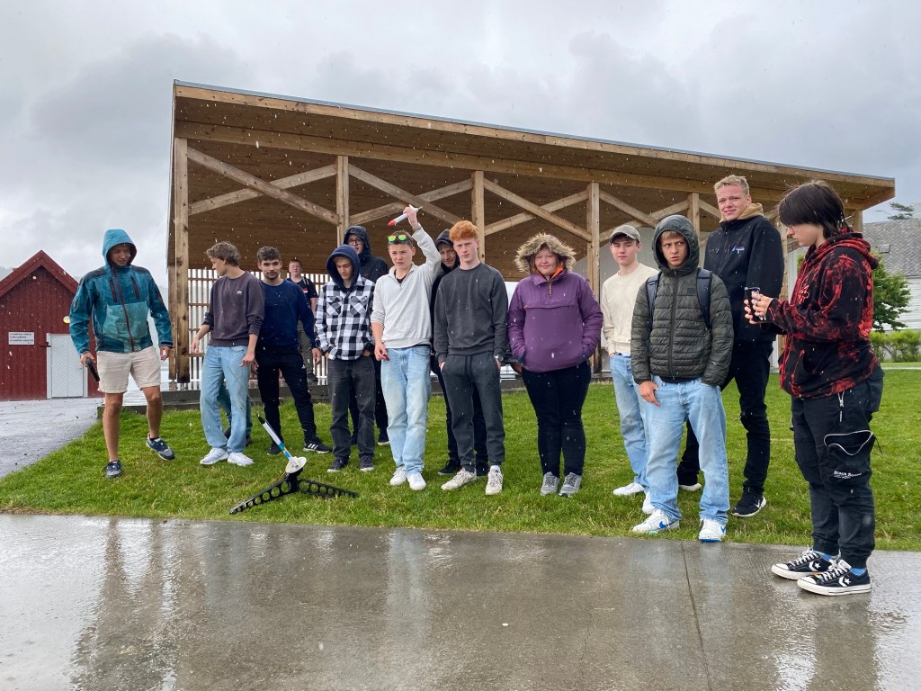Vi avsluttet skoleåret med å sende opp hjemmelagde raketter med elektrisk tenner, rakettmotor og fallskjerm. En lærer med egen båt kjørte rundt i fjorden og plukket dem opp. Valgfag i Teknologi og Design.