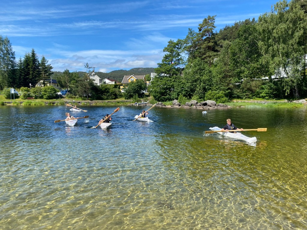 Vi har en nydelig dag i Selura. Elever fra 9. klasse har bygget sine egne båter av brøytestikker og landbruksplast. Nå er det konkurranse.