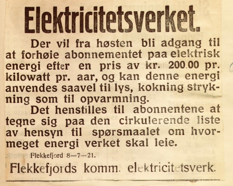 Et særtrekk for Flekkefjord Elektrisitetsverk var at det hadde kapasitet til å levere byens innbyggere mer strøm enn de behøvde til belysning. Det vanlige på den tid var å abonnere på et bestemt antall lyspærer. To til seks lyspærer med et samlet forbruk på 25 til 100 watt var det vanlige. Elverket reklamerte derfor også for bruk av strøm til oppvarming og koking. 1907 var første året ovner og kokeplater ble tillatt. De fleste nøyde seg nok i starten med en enkel kokeplate.